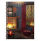 Un coin lecture confortable par jour pluvieux d'automne. Autour du foyer, un feu éclatant, des fauteuils rouges moelleux, des piles de livres, des teacakes et une théière complètent le confort. À l'extérieur, un saule jaune et une haie d'érable et de hêtre rouges sont obscurcis par la pluie qui s'enflamme, qui asperge la fenêtre où un chat gingembre s'assoit en regardant dehors.
