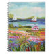 Deux voiliers et Cottage I de Karen Fields. Scène ludique et lumineuse avec fleurs, arbres, cottage et voiliers sur l'eau.