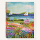 Deux voiliers et Cottage I de Karen Fields. Scène ludique et lumineuse avec fleurs, arbres, cottage et voiliers sur l'eau.