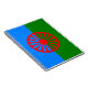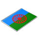 Ce dessin est orné du drapeau romani, qui est le drapeau international du peuple romani. Le drapeau est constitué d'un arrière - plan de bleu et de vert, représentant respectivement les cieux et la terre ; il contient également un chakra rouge à 16 branches, ou carrousel, au centre, qui représente la tradition itinérante du peuple romani et est aussi un hommage au drapeau de l'Inde. Le drapeau a été approuvé par les représentants de diverses communautés roms lors du premier Congrès mondial des Roms (WRC), qui s'est tenu à Orpington en 1971.