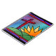 Un design en vitrail illustrant le matin de Pâques, avec une croix rouge sur des collines verdoyantes au bord d'un lever de soleil enflammé.