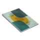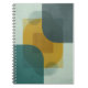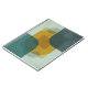A modern, abstract geometric poster design featuring overlapping translucent shapes. The composition is divided into four quadrants with textured, muted background colors (soft teal, light sage, dark charcoal/slate). Central to the design are a large, vibrant mustard yellow curved shape and several partially visible, translucent teal/grey circles and rectangles. The artwork is characterized by its sharp lines, clean edges, and contemporary color palette, creating a sense of depth and dynamic movement through the interplay of transparency and opaque forms.