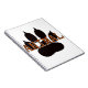 Une patte d'animal noir et des empreintes de griffe avec du texte brun. Design original.