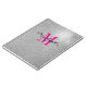 Carnet en spirale monogramme de parties scintillant argentée glamour. Fournitures de bureau et d'école monogrammées à la texture fausse argentée. Ajoutez votre propre lettre initiale de nom classe. Élégante typographie de script. Design métallique chic pour écrire des notes, des travaux de bureau, la planification mariage et plus encore. Logo rose néon et noir avec éclat brillant et scintillant arrière - plan.