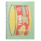 Un style publicitaire rétro illustrant une boîte de thon. Cette boîte de poisson a un étiquette qui dit que le thon est élevé dans Oméga 3 et pêché de manière durable. Attention à tous ceux qui aiment la nourriture en conserve / en conserve