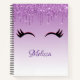 Un carnet au design design design et tendance. L'arrière - plan est un dégradé violet avec une image de fausse parties scintillant scintillante qui descend du haut. Une paire de cils mignons ceinturés sous l'image de la parties scintillant.