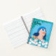 Femme rétro avec fleurs et soleil et lunettes de soleil, rouge à lèvres brillant et cheveux foncés. Quelle scène de plage ensoleillée et colorée sur un journal en spirale.