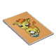 Une girafe jaune et orange colorée souriant heureusement vers le bas à un banana split dans une cuvette bleue.