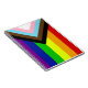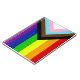 La variante "Progress" du drapeau arc-en-ciel ajoute un chevron le long de la hanche, qui présente des rayures noires, marron, bleu clair, roses et blanches pour mettre ces communautés (personnes marginalisées de couleur, personnes trans, personnes vivant avec le VIH/SIDA et celles qui ont été perdues) au premier plan ; "la flèche pointe vers la droite pour montrer le mouvement vers l'avant, tout en étant le long du bord gauche montre que des progrès doivent encore être réalisés."
