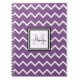 Carnet en spirale motif de chevron blanc et violet personnalisé avec nom en noir et monogramme de couleur violet plus clair.