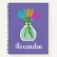 Ajoutez votre nom à ce magnifique carnet de croquis pour en faire votre propre carnet. Trois fleurs en bleu, or et rose avec un effet parties scintillant dans un vase à l'eau sont présentées dans le design.
