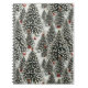 Carnet dans une forêt d'arbres de Noël enneigés, en noir, blanc et gris, avec une dispersion de petits paquets rouges
