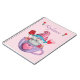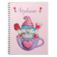 Ce carnet en spirale adorable présente un gnome drôle avec une grande moustache et une longue barbe, assis dans une tasse violette au coeur rose. Il porte des lunettes roses et un casquette rayé rouge et blanc avec un bord bleu. Il tient une rose rouge et un chocolat au coeur. Il est personnalisé en haut avec votre nom avec un rose en forme de coeur de chaque côté.