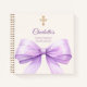 A cream, beige background color. Decorated with a large lavender colored bow and a golden cross. Personalize and add the name and date.