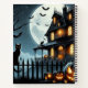 Une maison effrayante avec pleine lune, chat, citrouilles et chauves-souris