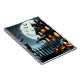 Une maison effrayante avec pleine lune, chat, citrouilles et chauves-souris
