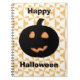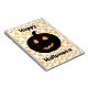 Un jack-o-lanterne souriant souhaitant un Happy Halloween s'installe au sommet d'un motif numériquement conçu sur mesure pour diffuser des formes abstraites de roue de patinage.
