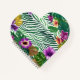 L'image montre une mosaïque vivante de feuilles de Monstera abondantes, vertes et jaunes, combinées à des fleurs magnifiques de couleur pourpre et d'oranges qui se détachent d'un fond dynamique et ondulé. Il émet une énergie sauvage et tropicale et une abondance joyeuse qui éveille curiosité et amour naturel.