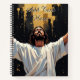 A striking emotional ai depiction of Jesus Christ Our Savior in black and gold. Jesus raising his arms to the Heavens with a black and gold impasto oil background.