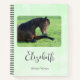 Un carnet en spirale personnalisé avec une belle photo représentant un beau cheval de baie brun posé dans l'herbe, à l'air paisible et content.