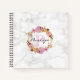 Carnet en spirale carré conçu avec une couronne fleurie faite de fleurs roses et oranges et de brindilles, sprigs et feuilles. Cette image numérique a été créée à l'origine avec des aquarelles et est mignonne et tendance. L'arrière - plan est une image d'élégant marbre blanc. Personnalisez avec une initiale et un nom monogramme.