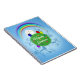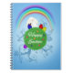 Illustration de Pâques : planète de Pâques avec des œufs colorés, un lapin mignon, un papillon, un arc-en-ciel, des fleurs et des ornements floraux sur un fond bleu clair.