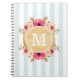 Carnet avec le motif rayé en bon état, les fleurs d'aquarelle et le monogramme roses de coutume de feuille d'or de faux.