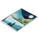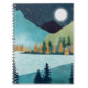 Un magnifique paysage aux textures uniques qui montre un paysage lacustre de montagne avec une lune montante et un ciel étoilé dans les tons bleu, or, vert et turquoise.
