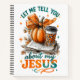 Design paisible et coloré avec une scène automne / automne avec un livre ouvert, citrouille et café. Le texte inspirant et coloré dit : "Laissez-moi vous parler de mon Jésus". Ce design est disponible sur une grande variété de produits.