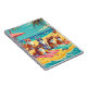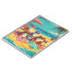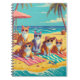 Carnet en cinq chats design se détendent sur une plage ensoleillée, allongés sur des serviettes à rayures sous des palmiers. Ils portent des lunettes de soleil colorées et des casquettes en paille, profitant d'un séjour tropical, avec une mer turquoise et un ciel bleu vif derrière eux.