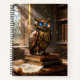 A clockwork owl with saphhire eyes is perched on a stack of books in an old library. Dust, or perhaps smoke from overheated servos, rises around it. Very nice steampunk image!