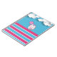 Ce dessin montre une licorne heureuse tenant une grande lollipop, volant sous des nuages blancs avec un arrière - plan rayé coloré