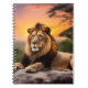 Beau lion allongé sur un rocher avec le coucher du soleil de la jungle derrière