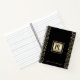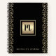 Un carré de papier doré avec un monogramme en écriture noire et un nom personnalisé, ainsi que des bandes oblongues dorées à motif pointillé sur fond noir, mettent en valeur ce cahier spirale chic, féminin et moderne. 8 modèles de papier différents à choisir à l'intérieur. Fait une déclaration stylée chaque fois que vous l'utilisez. Un excellent cadeau pour un ami, ainsi que pour vous-même !