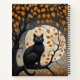 A majestic black cat with piercing yellow eyes sits poised on the gnarled, dark branches of a tree against the backdrop of a massive, pale full moon. The scene is dramatically rendered in moody shades of black, grey, and brown, contrasting sharply with the vibrant orange and gold autumnal leaves that cling to the branches and drift through the air. The style evokes a classic, almost storybook-like quality, fused with an unsettling, bold edge. The composition is centered and intense, capturing a feeling of mystery and the folklore associated with Halloween and the autumn season.