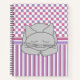 Une image d'un chat qui dort gris avec un sourire sur son visage contre un motif rose, violet et gris est un design unique pour les amateurs de félins.