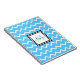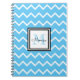 Carnet en spirale motif chevron blanc et bleu personnalisé avec un nom en noir et monogramme dans l'ombre bleue assortie.