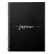 Cahier de notes en spirale avec monogramme noir moderne et simple, nom féminin et signature. Ce design minimaliste de couleur unie présente votre prénom dans une jolie typographie de lettrage manuscrit avec des fioritures blanches sur fond noir et est facile à personnaliser. Cadeau personnalisé et girly pour une fête d'anniversaire, une fête d'anniversaire pour les 16 ans, un mariage, une douche de mariée, une douche bébé et pour quiconque aime le style minimaliste.