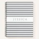 Carnet spirale avec une impression de nom personnalisée sur un motif rayé gris et blanc minimaliste.