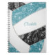 Ce joli carnet à thème volleyball présente l'image réaliste d'un volleyball abstrait surdimensionné qui a des panneaux turquoises, noirs et blancs avec des fleurs de doodle délicates dessinées à la main, des plumes et des paislies en blanc modelé sur les panneaux turquoises et noirs du volleyball - customiser avec le nom de l'athlète - par katz_d_zynes