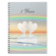 Cahier avec mon design numérique de deux cœurs en papier flottant sur l'eau sous un arc-en-ciel. Le texte personnalisable dit "1 an".