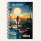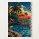 Art vectoriel détaillé aux couleurs vives d'une femme en maillot de bain par une piscine ronde sur un somptueux patio entouré d'un jardin tropical et de palmiers avec vue sur la baie de Biscayne avec le soleil se levant sur la chaîne de l'île de Miami Beach au loin. Inclut le texte personnalisable (ou amovible) "Miami" et votre nom.