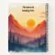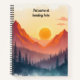 A stunning digital painting of a serene mountain landscape at sunset. The warm orange sun sets between two glowing red-orange mountain peaks, casting a soft golden light across the scene. Layers of evergreen trees fade into misty blue tones in the foreground, creating depth and tranquility. The soft clouds and watercolor texture give the image a dreamy, boho aesthetic