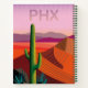 Ce design est une affiche contemporaine avec une simple expression graphique du paysage désertique dans le rouge chaud, le rose et le violet avec au premier plan des cactus saguaro. L'abréviation "PHX" apparaît en haut de l'affiche et "Arizona" en petit blanc en bas.