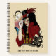 Une femme aux cheveux noirs en tenue steampunk victorienne rouge. poulpe tribale noire, horloge, papillon bleu et rose