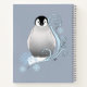 Une mignonne poussette de pingouin avec de la neige et des flocons de neige dans un décor gris bleu clair, le tout dessiné dans un style Art nouveau