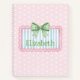 This cute notebook features a pink frame with blue and white stripes and topped with a preppy green and white gingham plaid bow on a background of pink and white polka dots on each side. Personalize with your choice of name or special text on the front and back. Fun for personalized party favors and gift bags.