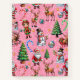 Christmas-themed pattern featuring Santa Claus, reindeer, snowmen, elves, Christmas trees, candy canes, and snowflakes on a pink background