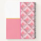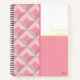 The artist's pattern design of pink geometric squares is on the side of the notebook, front and back. The other is white and pink squares with a yellow line in the middle. And the text can be personalized by the customer.