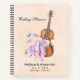 Un wedding planner carnet en spirale personnalisé avec les noms de la mariée et du marié, date du mariage et ville. Illustré d'une aquarelle représentant un violon en bois, des pantoufles de ballet rose se reposent contre elle et sont décorés de fleurs et de papillons. Placez-vous sur un arrière - plan rose pêche.